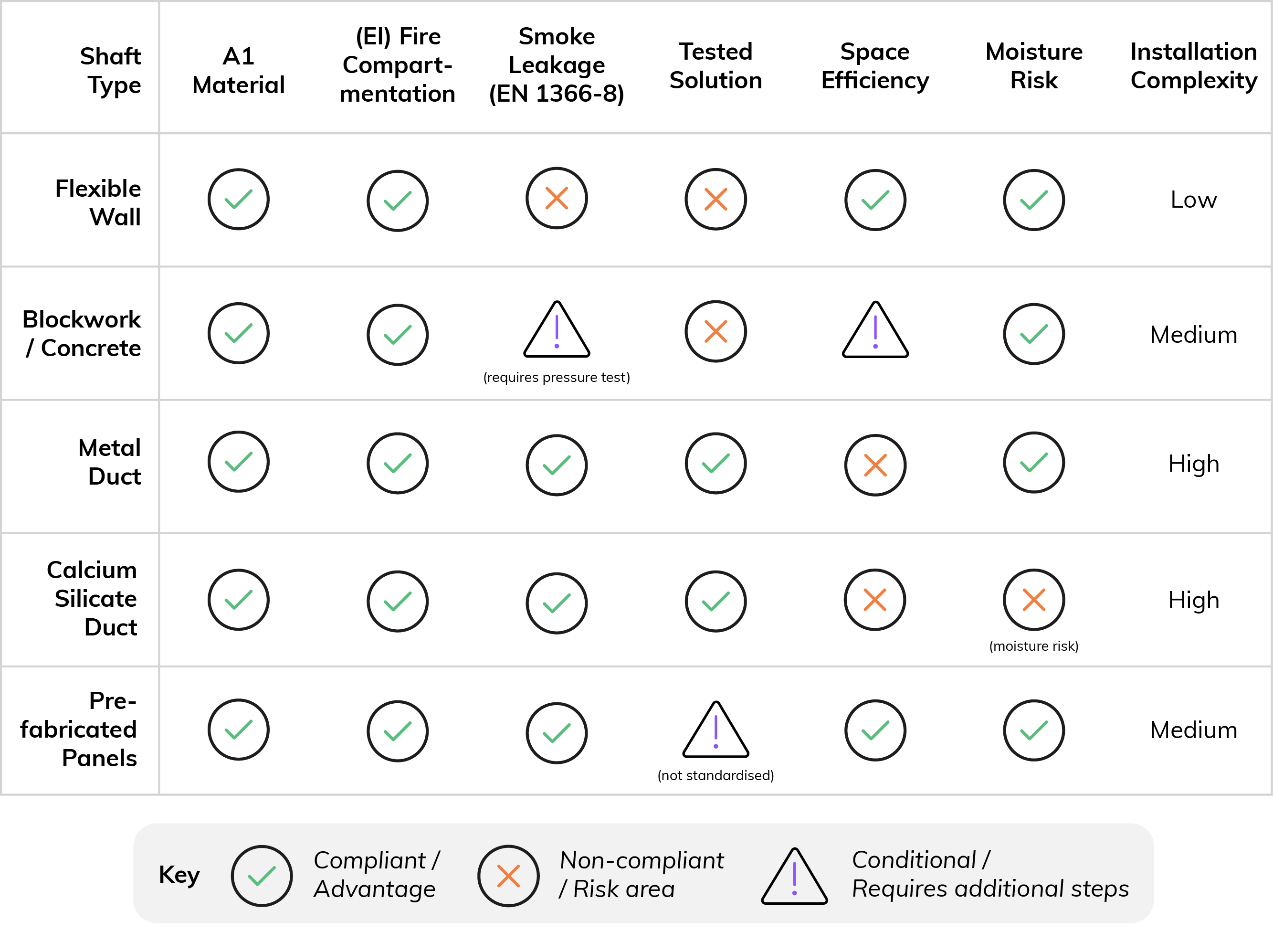 The infographic below highlights the compliance risks and considerations associated with each smoke shaft construction method.
